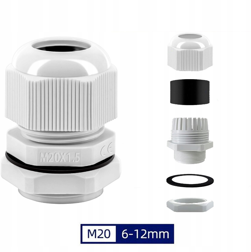 Dławiki kablowe są wyposażone w nakrętkę zabezpieczającą, gumowe uszczelki i podkładkę zapewniającą pełne uszczelnienie.